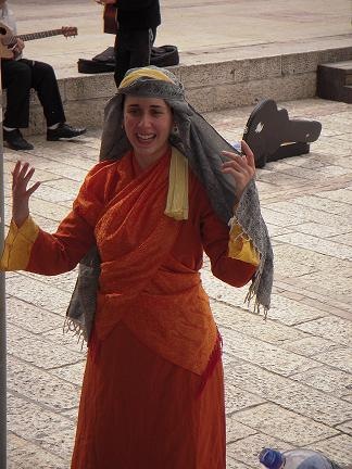 את הקבוצה היא פוגשת בקבר דוד בתור קבצנית. תוך כדי המפגש הם מבינים שזאת בעצם שחקנית. אחר כך היא מורידה את התחפושת ומציגה את עצמה בתור המדריכה. בהמשך היא מציגה ומדריכה לסירוגין (בעיקר מציגה). הדמות השנייה היא דמות של כלה ממשכנות שאננים. התחנה היא בתצפית על משכנות מפינת החומה. הדמות השלישית היא של בת כוהנים מימי בית שני. מתצפית גגות. כל המסלול: כשעה וחצי .