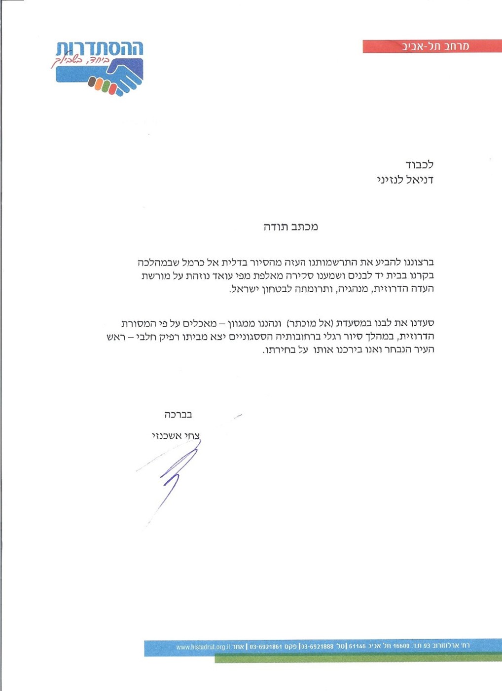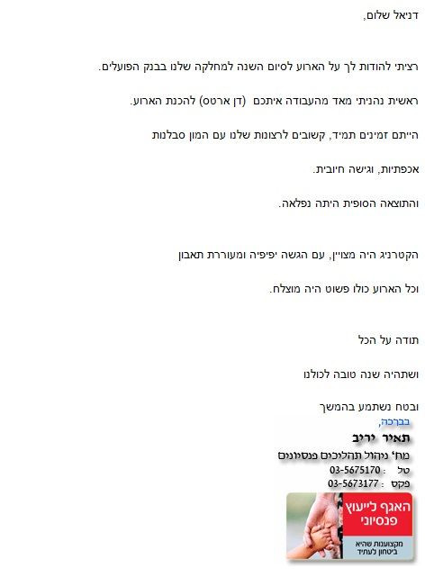 מכתב תודה על הפקת נופש "עמותת שיקום אחר" |